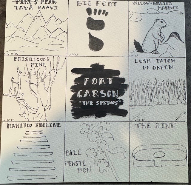 Deep sips of mountain air, lush green, and summer heat tempered by short bursts of heavy mountain rain. “I missed this place more than I had realized!” That’s the thought reverberating in my mind as I arrived in the Fort Carson/Colorado Springs (The Springs) area on 9 June. It took me only a few brief minutes on my drive into The Springs to realize that this placefield is where I left a huge part of my heart. This location is the first of six sites I am expecting to visit as a researcher this summer. I was previously stationed here, from 2019 to 2021, which was such a brief period as I reflect on it now. However, I am realizing that my military assignment was long enough to make some beautiful core memories with my children and the surrounding land.
