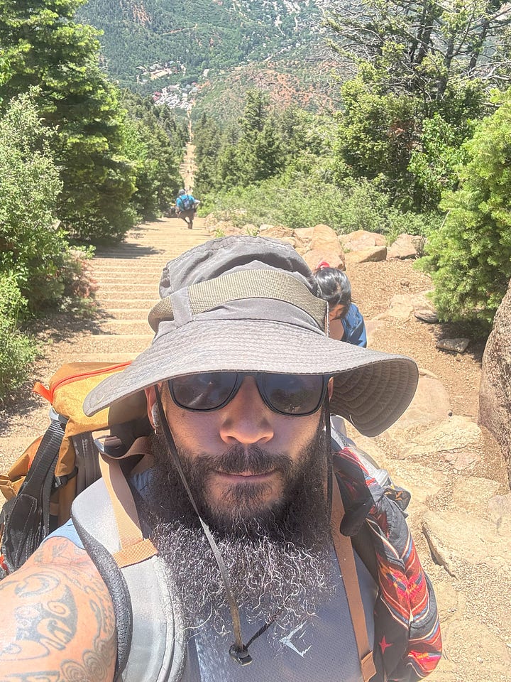A couple of days later, I decided to make another offering to the mountain. This time, it was sweat and perseverance at the Manitou Incline. The Incline sits at the base of the southern Rockies near Tava, and its story begins in 1907, as part of the development effort to build a hydroelectric plant and waterline. It became a popular attraction for hikers when it officially opened to the public in 2013. For me, the 2,768-step climb to the Manitou summit has always been more than just a hiking spot. Its an opportunity for a deeply reflective experience. The incline is a mirror that offers all sorts of insights into one’s character, especially when it comes to how they navigate hardship.